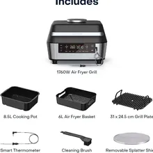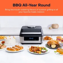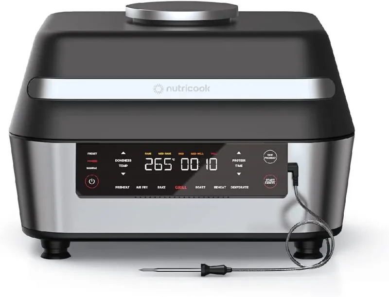 امکان انجام گریل گوشت و سبزیجات بدون ایجاد دود / تنظیم میزان پخت گوشت به صورت آب دار تا کاملا برشته شده / مجهز به دماسنج هوشمند با امکان تنظیم دمای پخت ایده آل برای 5 نوع پروتئین گوشت گاو، بره، مرغ، ماهی و گوشت گیاهی
