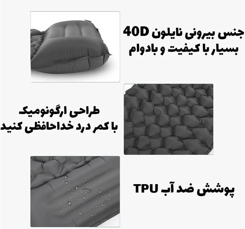 تشک بادی گرین لاین | راحتی همراه شما در سفر و کمپینگبا تشک بادی Green Lion، تجربهای متفاوت از سفر، طبیعتگردی یا حتی استراحت در خانه داشته باشید. طراحی هوشمندانه و کیفیت ساخت عالی این محصول، راحتی و آرامش رو به سبک حرفهای براتون فراهم میکنه.ویژگیهای برجسته:طراحی ارگونومیک و طبیفرم تشک کاملاً مطابق با انحنای بدن و ستون فقرات طراحی شده تا از دردهای گردن و کمر خبری نباشه؛ حتی برای استفادهی طولانیمدت.سیستم پخش هوای یکنواخت ساختار داخلی بهگونهای طراحی شده که هوا در کل تشک یکسان پخش بشه، بدون فرورفتگی یا برآمدگی هنگام غلت زدن یا نشستن.پمپ داخلی با عملکرد آسان فقط کافیه حدود 60 ثانیه با پای خود فشار وارد کنید تا تشک به طور کامل باد بشه — بدون نیاز به پمپ دستی یا برقی.سبک، کمجا و قابل حمل با کیف مخصوص و طراحی تاشوی هوشمند، بهراحتی در کولهپشتی یا صندوق ماشین جا میگیره.پارچه نایلونی با کیفیت بالاضد آب، ضد پارگی و قابل شستشو در دمای 40 درجه سانتیگراد، برای دوام بیشتر و نگهداری آسان.بالش توکارهمراه با یک بالش بادی داخلی، برای استراحتی راحت و بدون نیاز به بالش اضافی.مشخصات فنی:ظرفیت وزن: تا 100 کیلوگرم،زمان باد شدن: 60 تا 90 ثانیه،ابعاد در حالت استفاده: 190×58×6 سانتیمتر ابعاد در حالت تا شده: 24×10 سانتیمتر مناسب برای: سفر، کمپینگ، خانه، داخل ماشین و مهمانهای شبانه